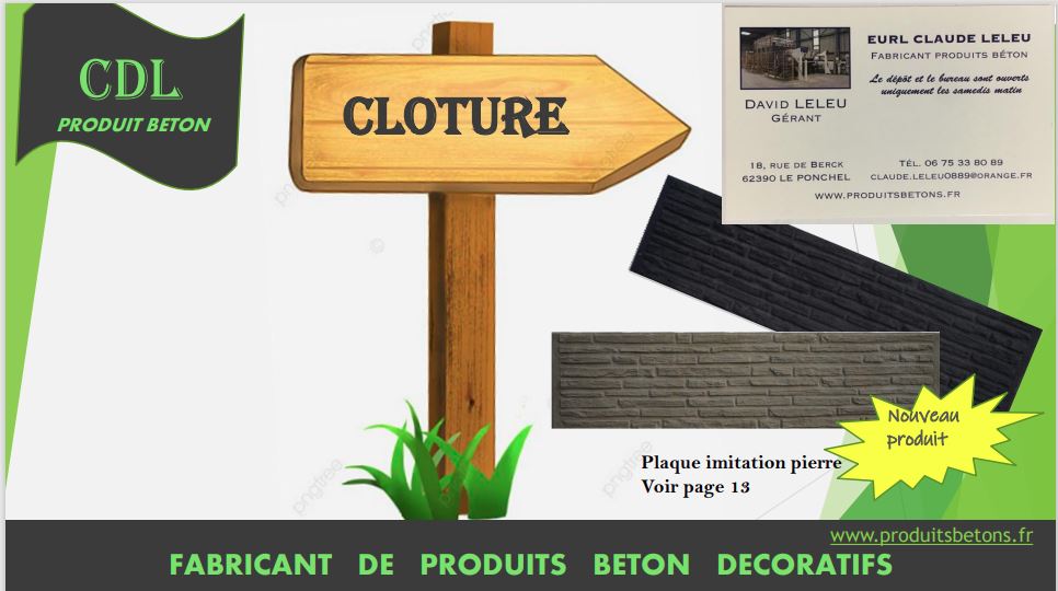EURL CLAUDE LELEU, spécialisé dans la préfabrication béton depuis 1973 (clôtures béton armé et murs de soutènement armé, gris, teinté dans la masse de différents coloris, gravillonné de différents coloris également, simple face et double faces, bacs à fleurs gravillonnés de différents coloris).